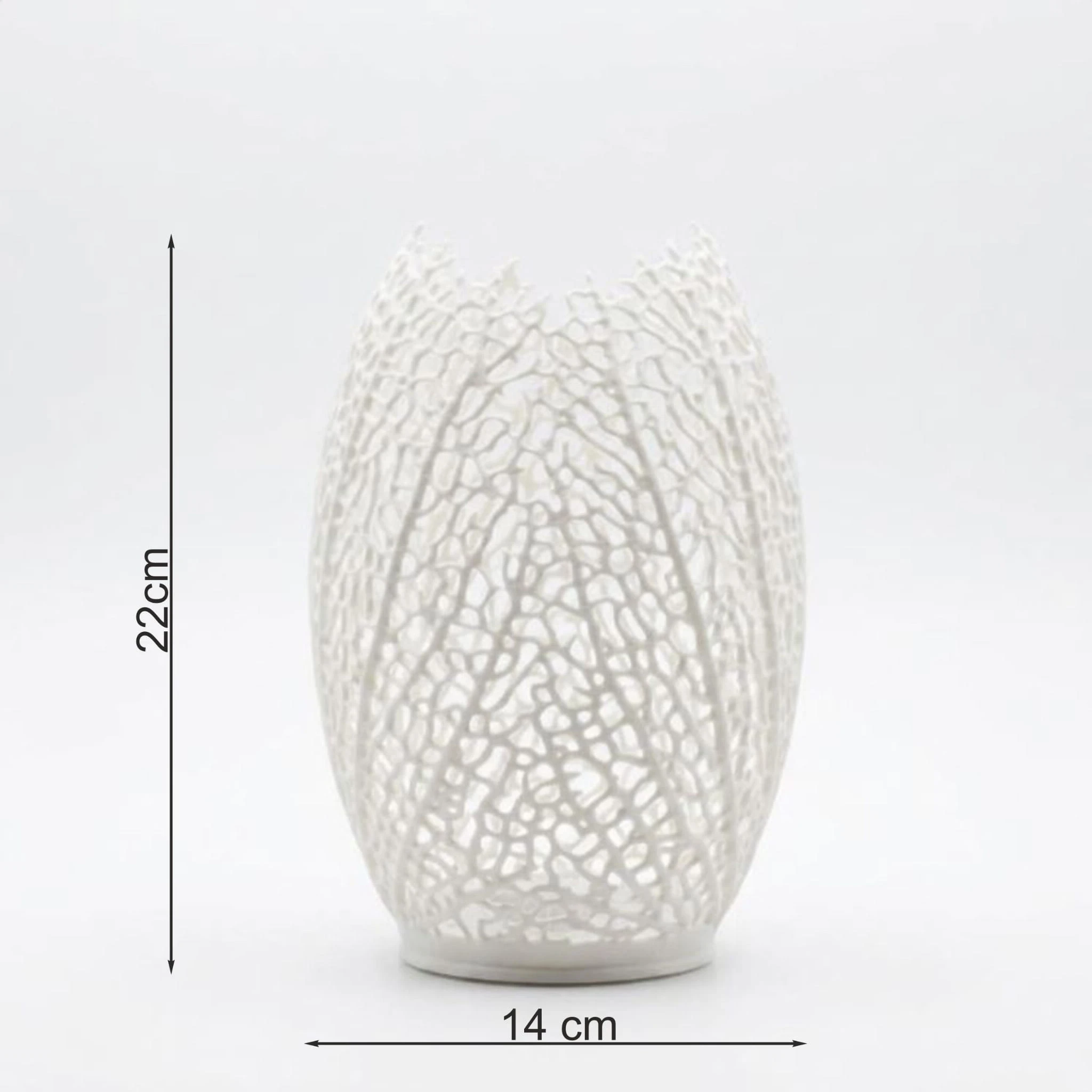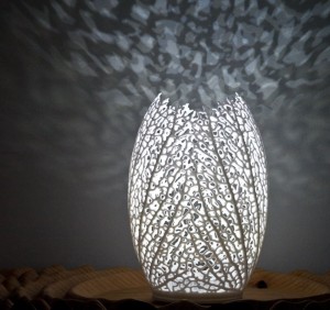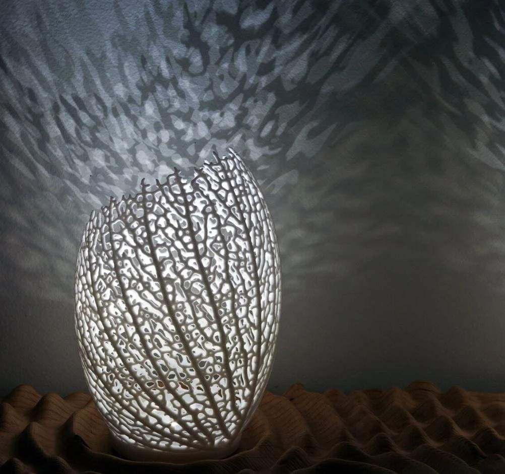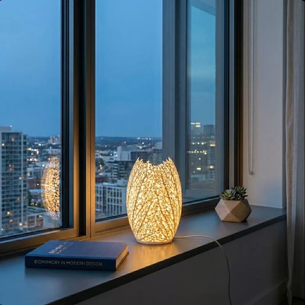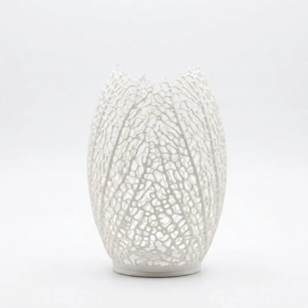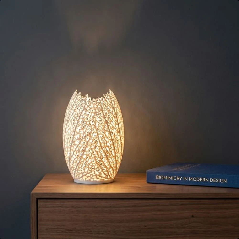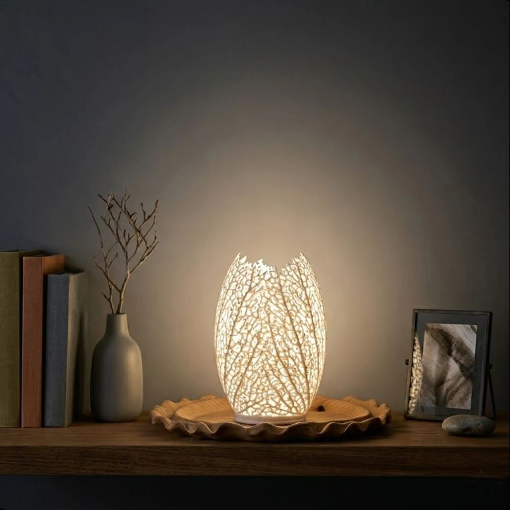 Oprawa o charakterystycznym, owalnym kształcie wyróżnia się misternym, ażurowym wzorem, który naśladuje naturalne żyłkowanie liści lub strukturę koralowca. Dzięki swojej unikalnej formie lampa emituje miękkie, nastrojowe światło, rzucając rzeźbiarskie cienie na otaczające ją powierzchnie. Model ten doskonale sprawdzi się w sypialni jako dekoracyjna lampka nocna, w salonie na komodzie lub jako nowoczesny akcent w gabinecie inspirowanym biomimetyką. Jej lekka i subtelna konstrukcja idealnie wpisuje się w jasne, minimalistyczne aranżacje stawiające na unikalny design.