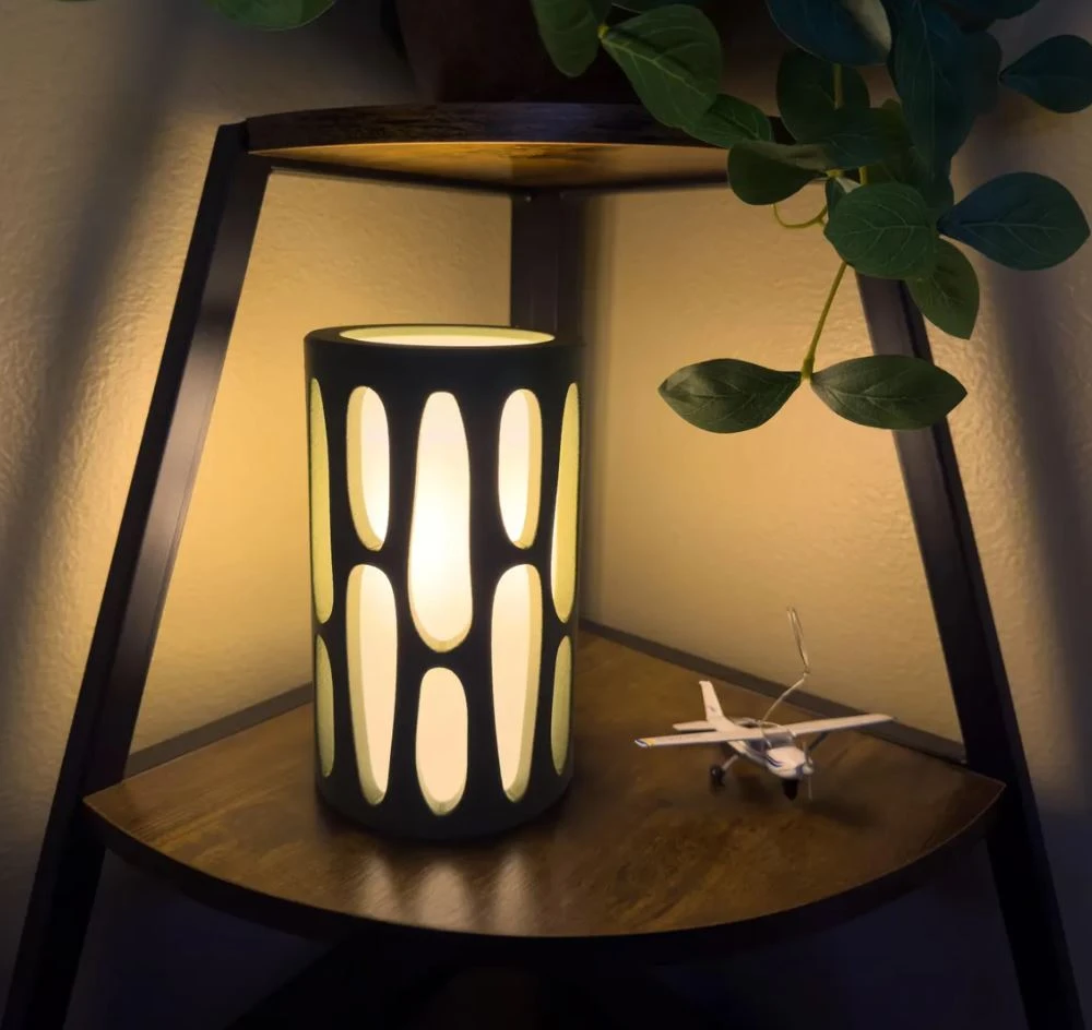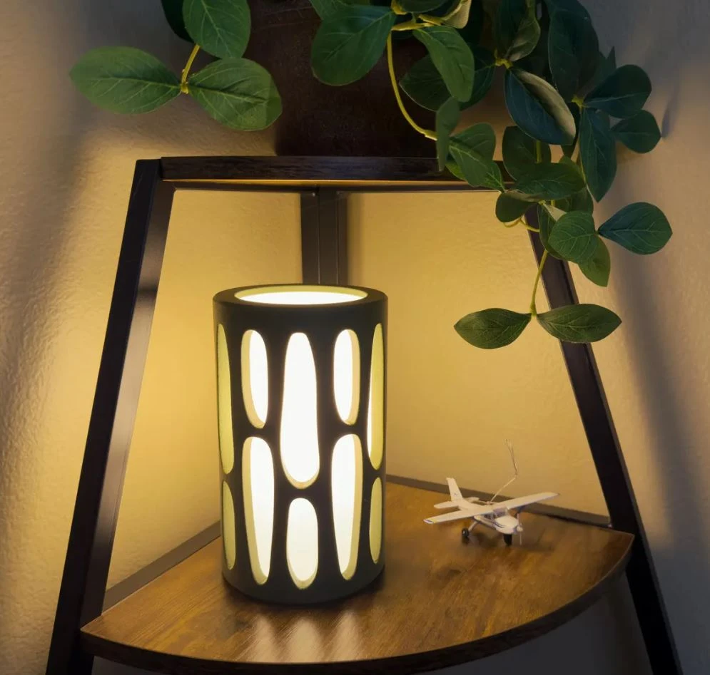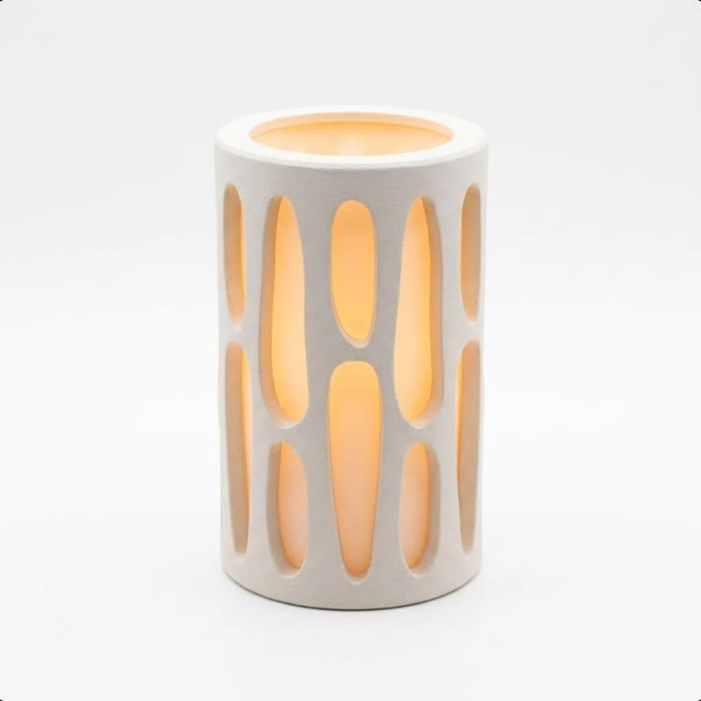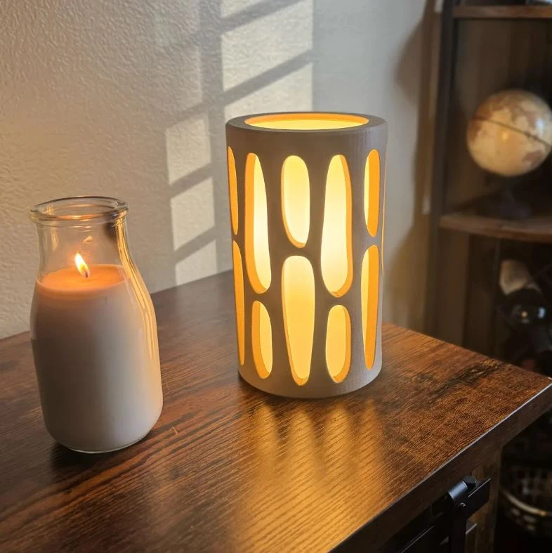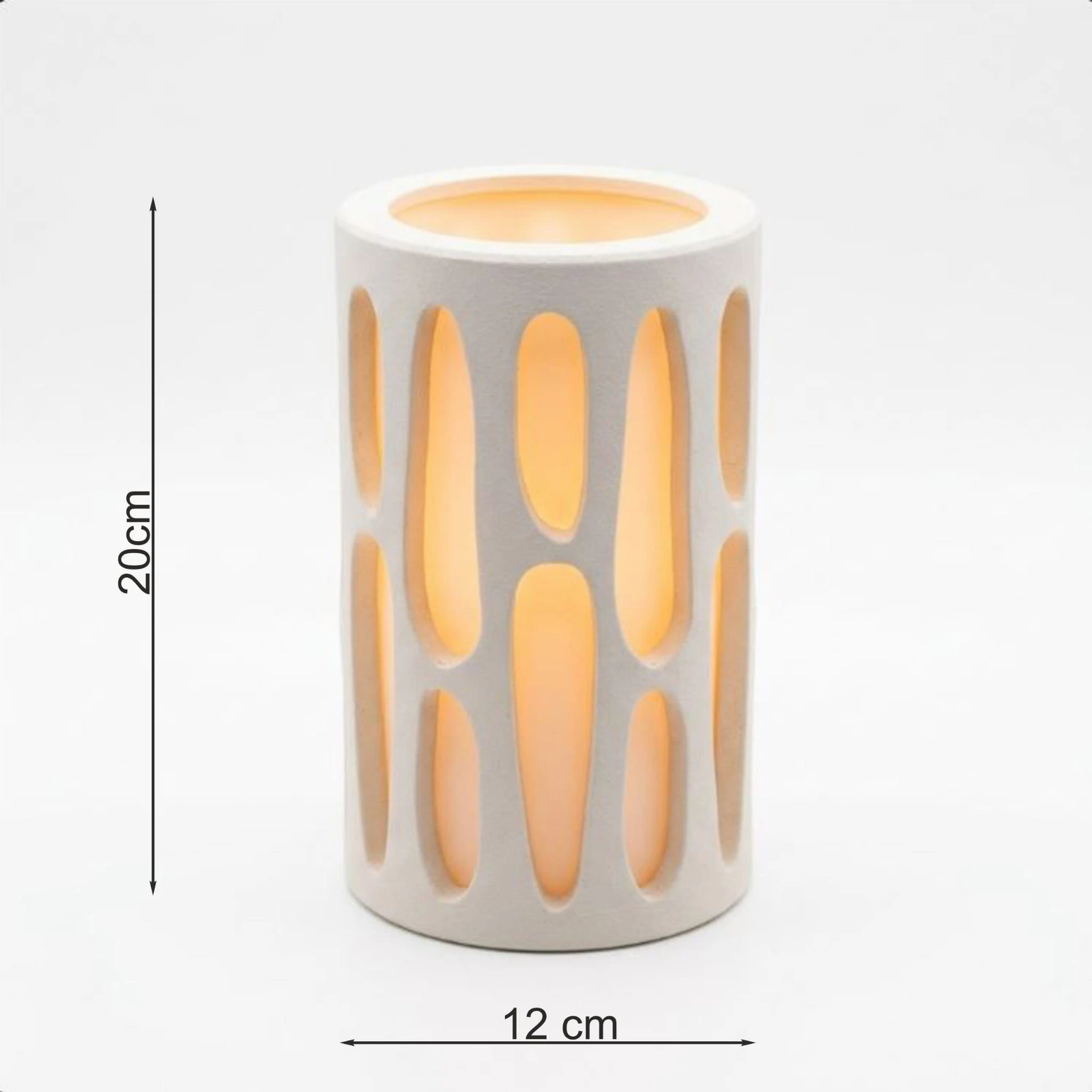Oprawa o cylindrycznym kształcie wyróżniająca się nieregularnymi, podłużnymi otworami o zaoblonych krawędziach. Dzięki swojej konstrukcji lampa emituje miękkie, nastrojowe światło, które przenika przez wycięcia, tworząc efektowną grę cieni na ścianach. Doskonale sprawdzi się jako lampka nocna w sypialni, dekoracyjne doświetlenie w salonie na komodzie lub element aranżacji w przedpokoju. Minimalistyczny design i naturalna tekstura idealnie wpisują się w estetykę japandi oraz wnętrza inspirowane stylem wabi-sabi.