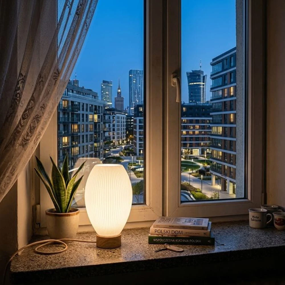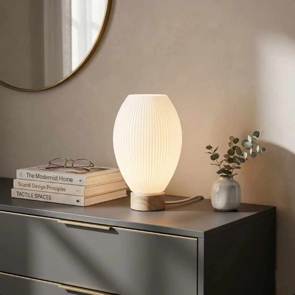 Oprawa o łagodnej, jajowatej formie, która dzięki pionowym tłoczeniom na powierzchni klosza tworzy wyjątkową grę światła i cienia w pomieszczeniu. Subtelne, nastrojowe oświetlenie doskonale sprawdzi się w sypialni na szafce nocnej lub w salonie jako minimalistyczny element dekoracyjny na komodzie. Jej harmonijny design wprowadza spokój do wnętrza, pasując idealnie do aranżacji w stylu zen, japandi oraz modern organic.