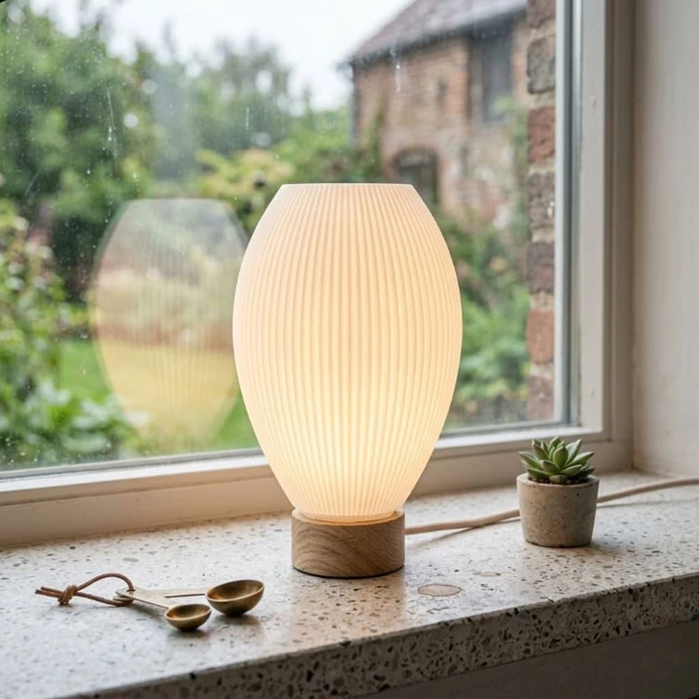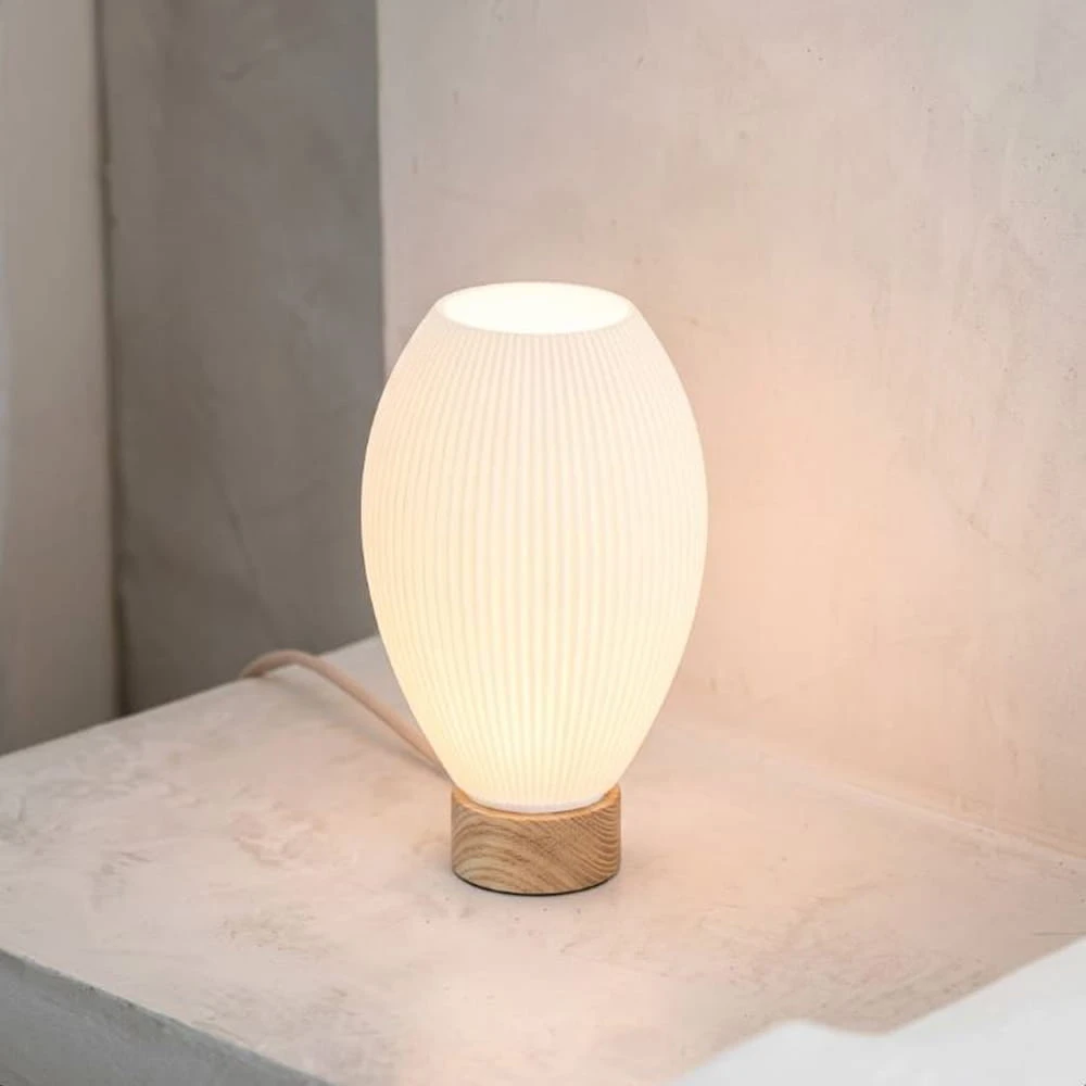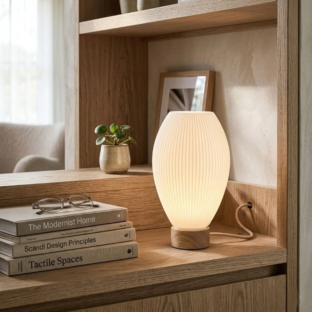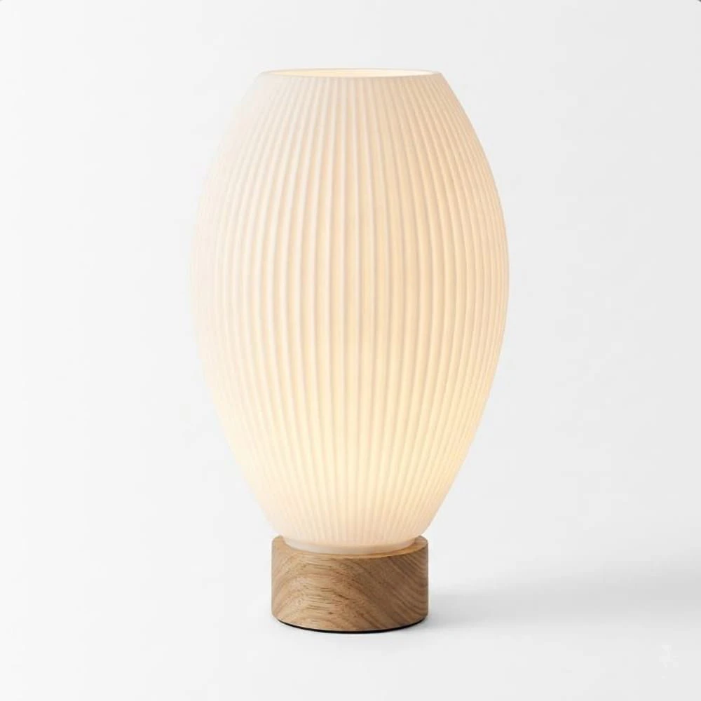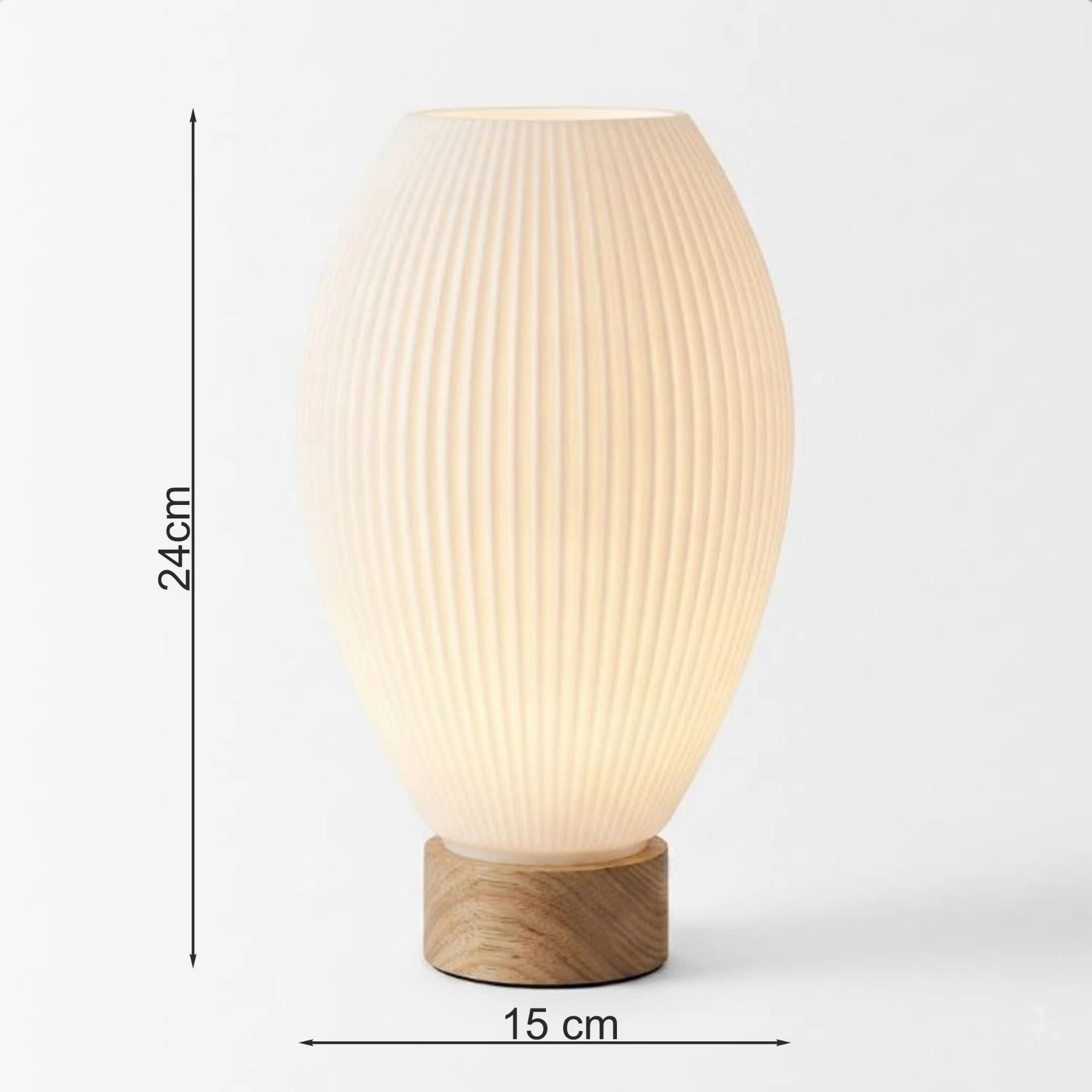Designerska lampa stołowa o obłym kształcie z prążkowanym kloszem i drewnianą podstawą, idealna do przytulnych wnętrz.