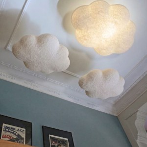 Uroczy biały plafon w kształcie chmurki, stworzony z myślą o przytulnym i nastrojowym oświetleniu pokoju dziecięcego.